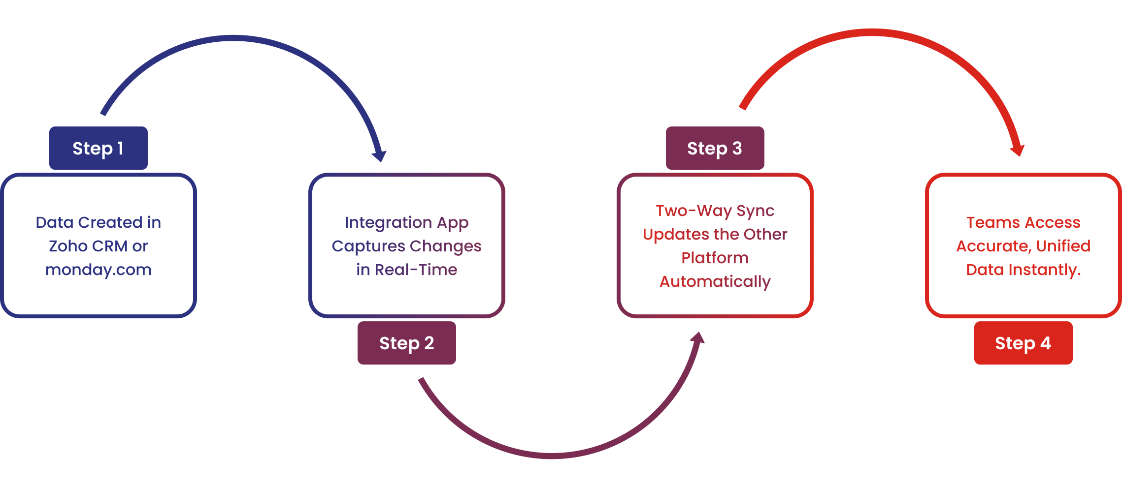 Our integration app enables users to effortlessly sync data between Zoho CRM and monday.com, making everyday work simpler and more efficient.