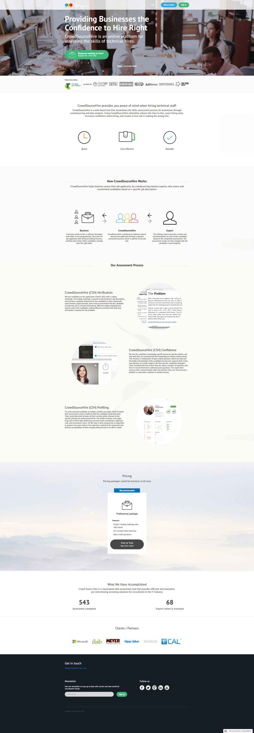 CrowdSourceHire is an online platform for assessing the skills of technical hires. The platform assists recruiters by offering a framework of assessment tools that match the most appropriate web industry “expert” to create the required assessment to determine the best candidate to hire.